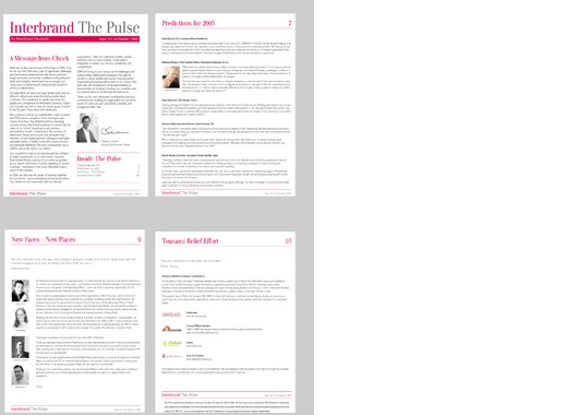 The Pulse is Interbrand’s quarterly newsletter. It contains an opening by Group CEO Charles E. Brymer followed by the sections success, predictions for the new year, new faces – new places, and a current social topic.